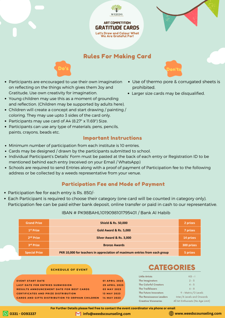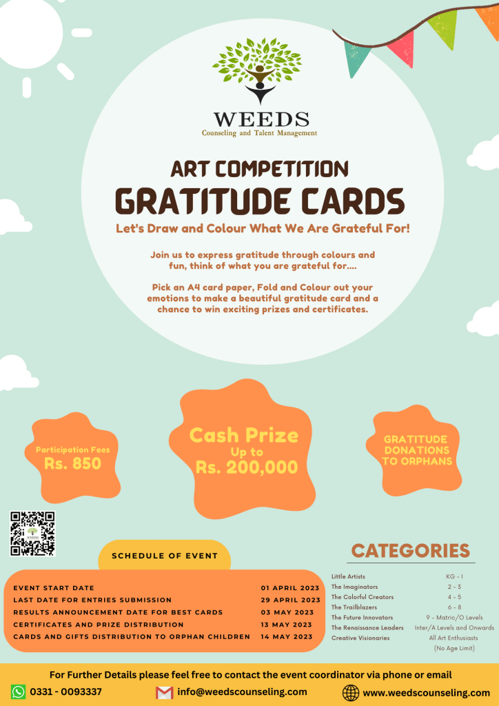 The theme is Gratitude, be it Family, Friends, Love, Home, Parents, Siblings, Shelter, Food, Safety, Health, Wealth, Knowledge, Nature, Skills, Glamour, Entertainment, Philanthropy, or anything that you feel thankful for, express yourself on an half folded A4 size Greeting Card and be a part of the largest amateur art Exhibition in Pakistan.